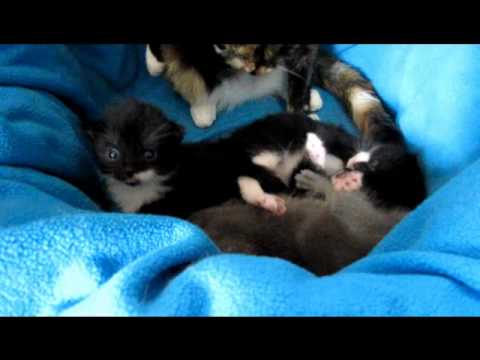De hoeveelheid gekaapte melk verschilt per dag per kitten. Waar de kleinste dame (in het filmpje links met het half witte snuitje) gisteren ineens weer maar 8 gram was aangekomen, was het vanmorgen juist 16 gram. Kennelijk is dat ten koste gegaan van de andere twee, die zijn namelijk maar ieder 9 aangekomen. Maargoed, zolang ze het netjes blijven afwisselen is er niets aan de hand.